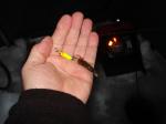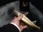 Jigging go-devils tipped with a minnow head has been the ticket for us. The green caught fish for the Dman while out with me yesterday. He also had a big walleye get off at the bottom of the hole earlier in the day. The story goes..."that it was the biggest walleye" he has ever had on!!! The tail on this fish was soooo big!!! oh well maybe another day Doug!!!
