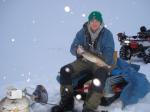 Our group gathered at Hunters for breakfest Saturday morning prior to our trip. Around the breakfest table we made plans to head out to the flats and fish till the weather would force us in. The snow was coming down at a pretty good rate as we started out just after daylight. Hunters Point has plowed roads to the Blue Jug and Boot Flat areas at this time. So our trip out was an easy ride other than the snow, cold and wind! Once off the plowed roads it got more difficult to get around on the Atvs pulling the gear. A snowmoblie would be a better in the snow covered conditions right now. I know I was stuck a few times trying to get too the spot! We setup on the southend of a flat and started to drill some holes. Once I found a fish on the Vexilar I setup the Otter and started to fish. Our group of six managed 15 walleyes in around 3+ hrs of fishing as we headed back off the lake at noon once the snow and wind picked up limiting our visibilites. Our fish ranged from 6-8 inches on up to 24-25 inches. We were using 1/8 and 1/4 oz. jigging spoons in 25-32 fow. The fish were on top early and later moved off the top. Had the weather been better I know we would have been more mobile and had more fish.