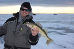 Is it January or March? With the weather and the numbers of jumbo perch, this weekend felt more like late season ice fishing. On Friday afternoon we headed up to the North end and found a lot of other anglers with the same idea. We kept on the move and picked up a nice mixed bag of walleyes and perch in 25-28 feet. Most of the ice in the area was 12-13" but we did find some that was only 10". On Saturday we carefully ventured out from the East side on snowmobile and ATVs. We found a large crack running North and South just East of 2 mile reef. There were some areas that were crossable on foot, but it isn't worth the risk with shifting ice conditions. We were able to fish some of the rock piles around Lakeside Reef and South. We did connect with some nice walleyes ranging from 21-26 inches. The ice was 10-12" in that area. In the afternoon we went back up North and found another nice mixed bag of fish. There were quite a few lookers on Saturday compared to the aggressive fish we found on Friday. Sunday was another nice day on the water. We fished a new area along the North end in 28-29 feet and found the same steady action with mainly walleyes. Over the deeper water we had varying ice depths of 8-12 inches. We caught many different year classes of walleyes ranging from 5-27 inches and perch from 3-13 inches. There are still large areas of open water and thin ice all along the East and North end.