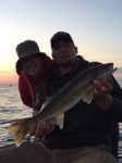 Got out a little bit over the some what wet weekend. Didn't have to put to much time in the boat to get rid of a half pound of leeches. Fishing was absolutely crazy evenings 8 - 10. Fished 18 foot over rocks and breaks with water temp at about 58. Caught fish from all year classes. If you didn't have a fish within 3-4 minutes something was wrong. Chaos is having 5 people in the boat with 4 of the 5 having fish on. Fun times.